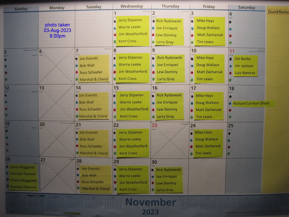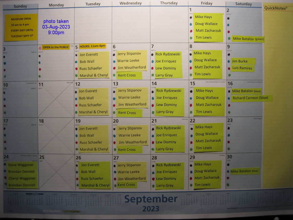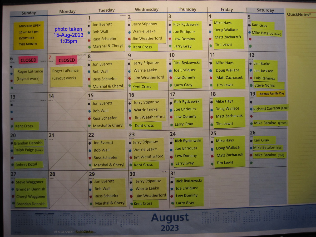 These photos were taken of the Layout calendar pages on the dates specified in the photos. To sign up to run during the months following the re-opening, email Roger LaFrance at admin@sd3r.org. NOTE: The Museum is now open to the public Tuesday through Sunday.